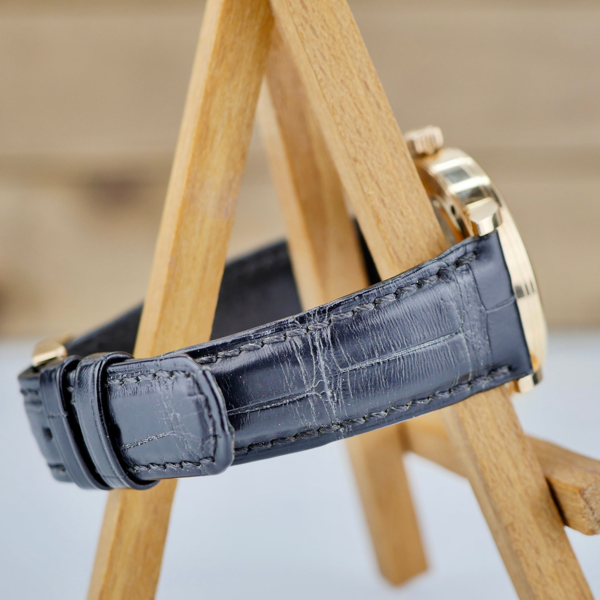 The A. Lange & Söhne 1815 Up/Down (Ref. 234.032) exemplifies the understated sophistication and technical mastery of German watchmaking. Crafted in 18k rose gold, the 39 mm case frames a beautifully balanced solid silver dial featuring the brand’s signature power reserve indicator (“Auf/Ab”) and small seconds sub-dial.