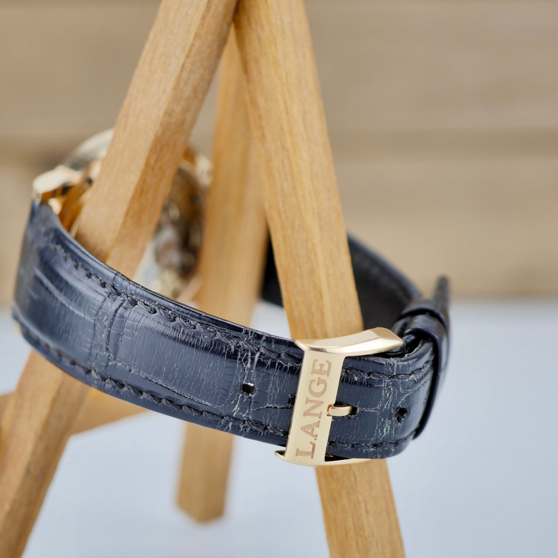 Powered by the Lange in-house manual-winding caliber L051.2, this movement showcases meticulous hand-finishing, blued screws, and the brand’s signature three-quarter plate in untreated German silver — visible through the sapphire crystal case back.