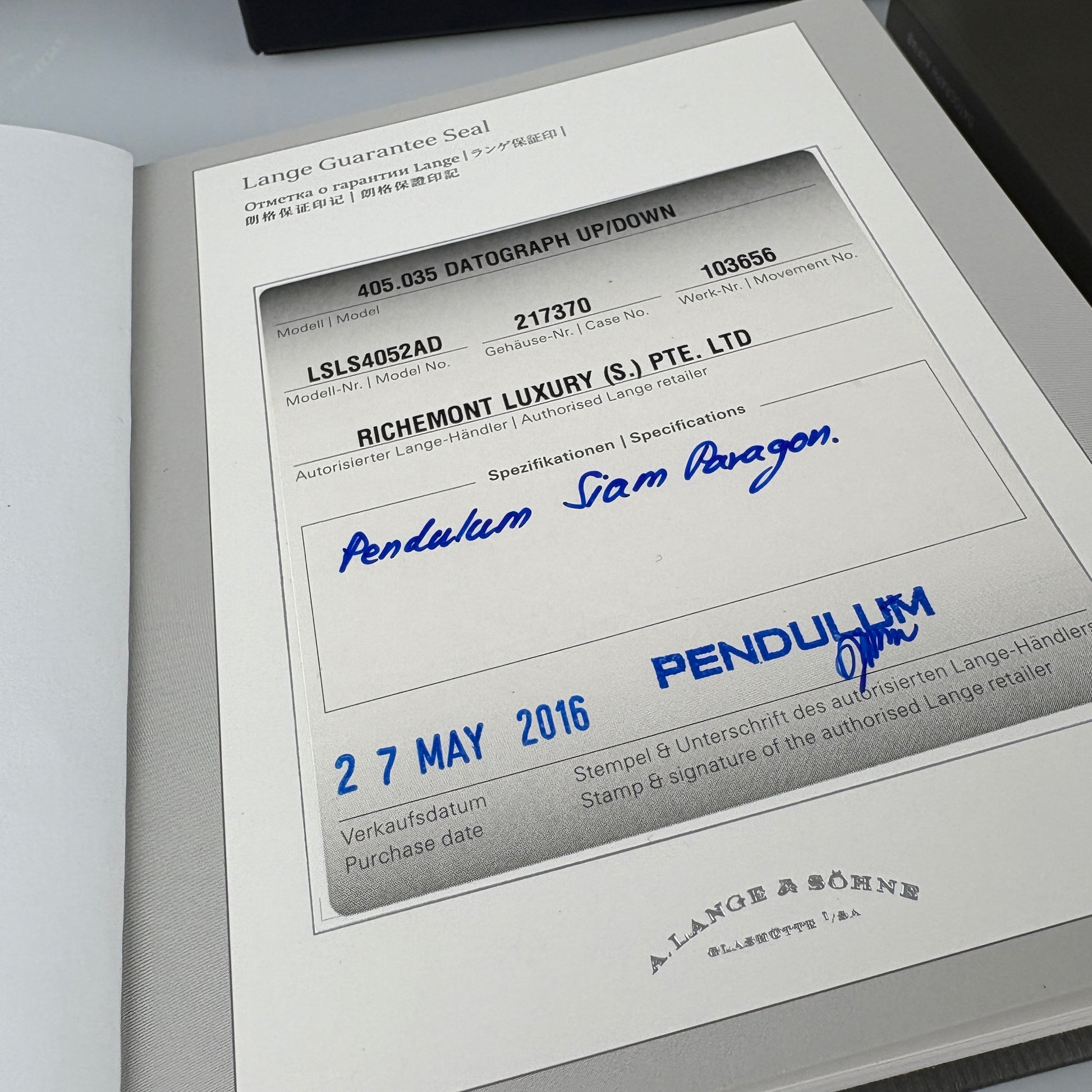 The A. Lange & Söhne Datograph Up/Down Ref. 405.035 stands as one of the most celebrated chronographs in modern haute horlogerie — a benchmark of movement architecture, finishing, and mechanical harmony.