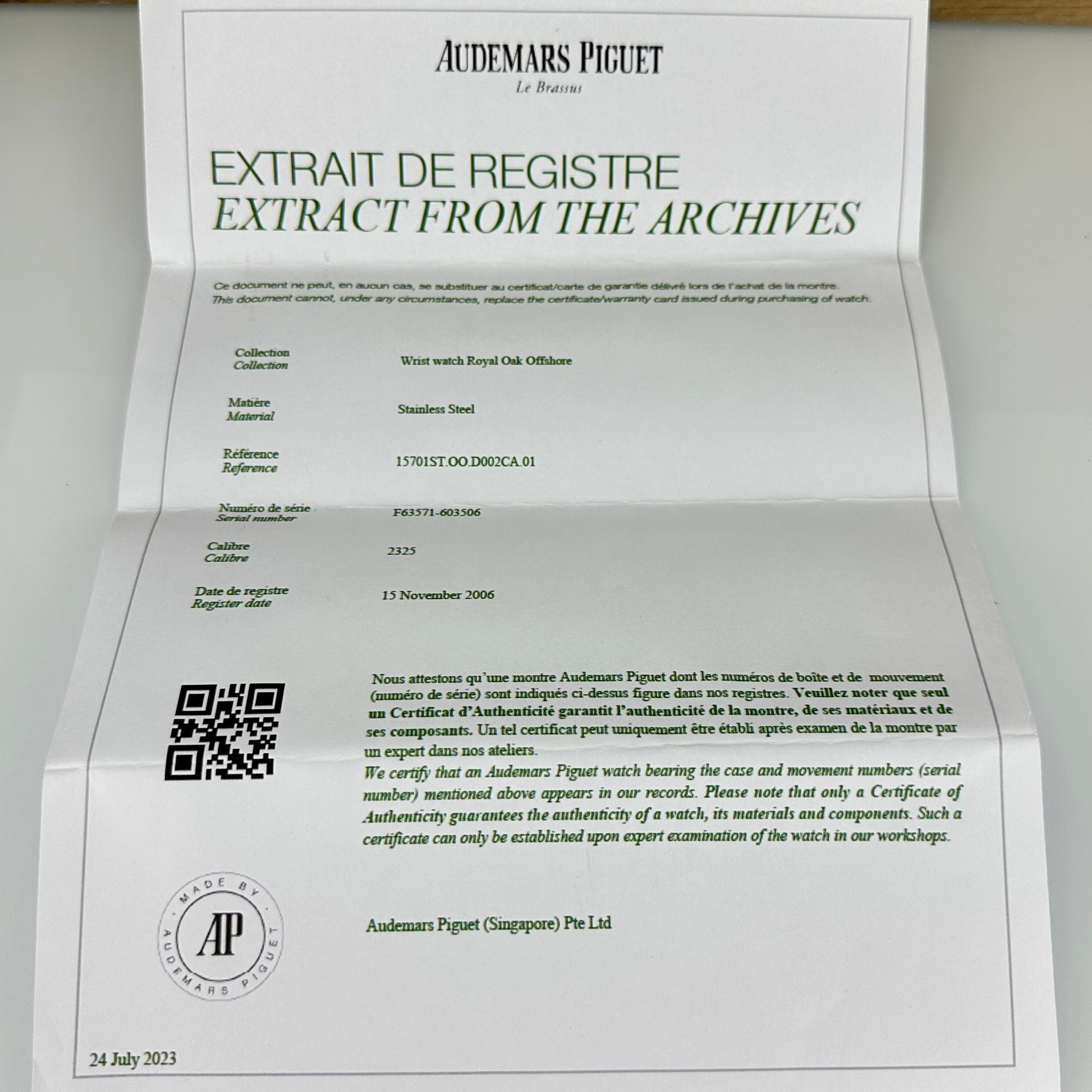 The Royal Oak Offshore Diver 15701ST.OO.D002CA.01 is a bold and technical expression of Audemars Piguet’s legendary craftsmanship. Housed in a robust 42mm stainless steel case with the iconic octagonal bezel and visible screws, this timepiece blends marine-grade durability with signature design elements that define the Royal Oak Offshore collection.