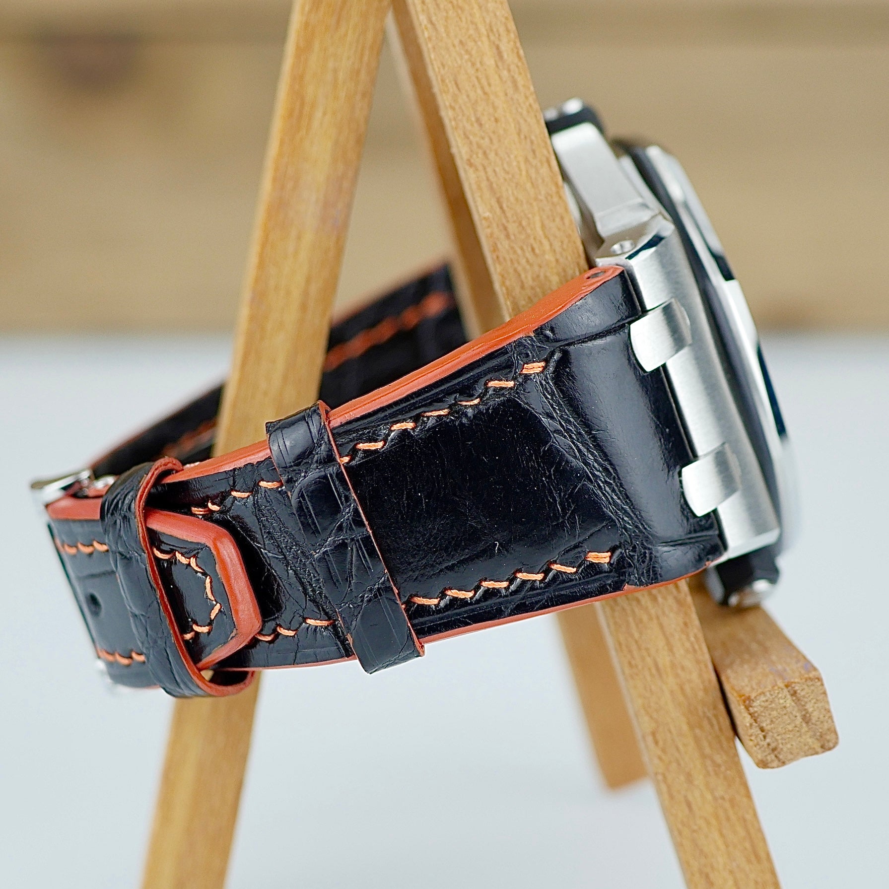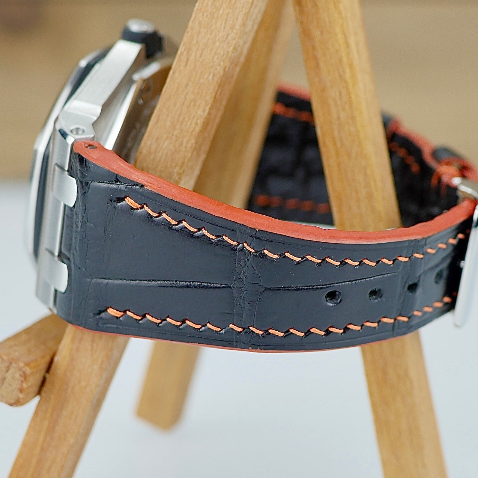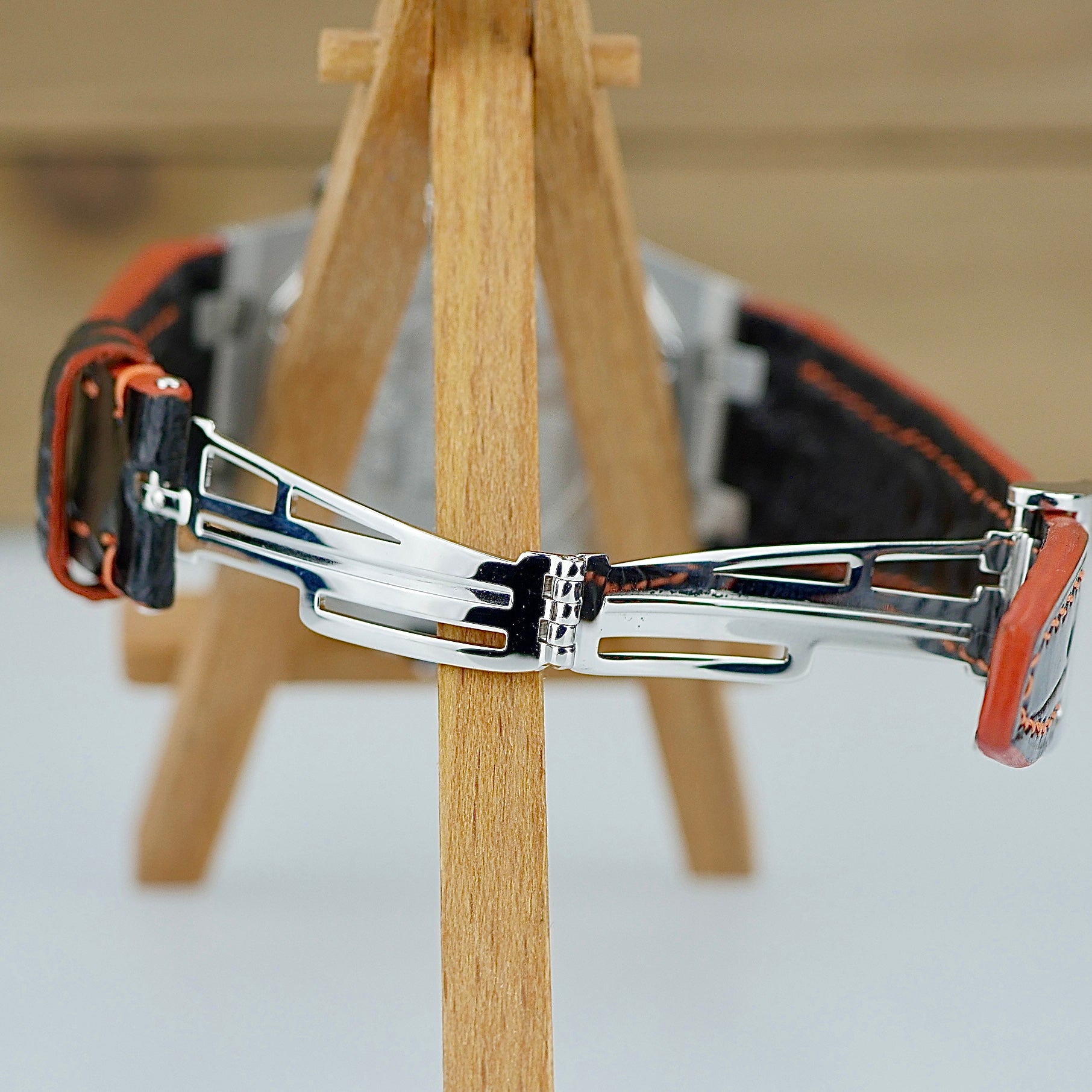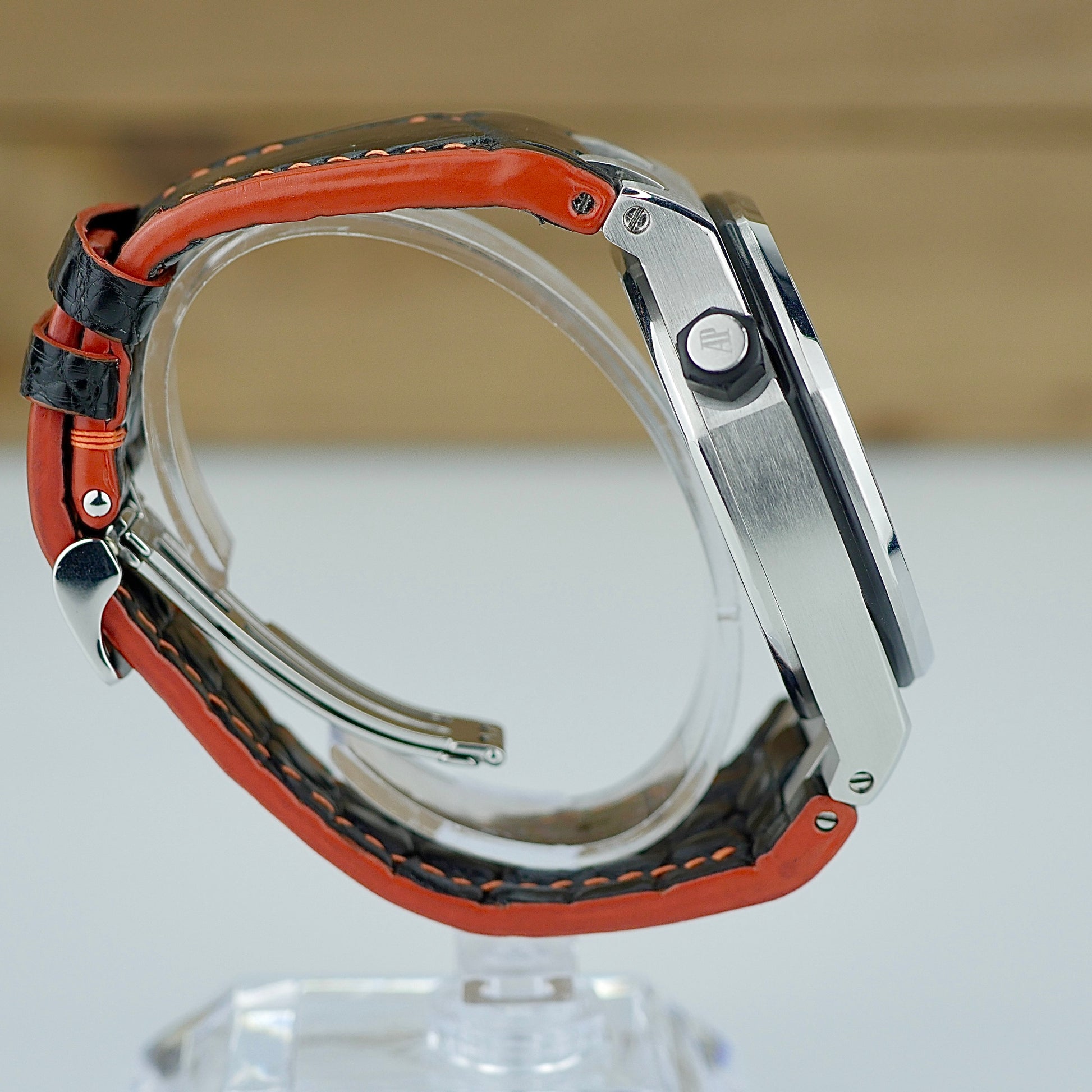 What sets this particular model apart is its black leather strap accented with bold orange stitching and detailing, delivering a sporty yet elevated aesthetic that turns heads both underwater and on land.