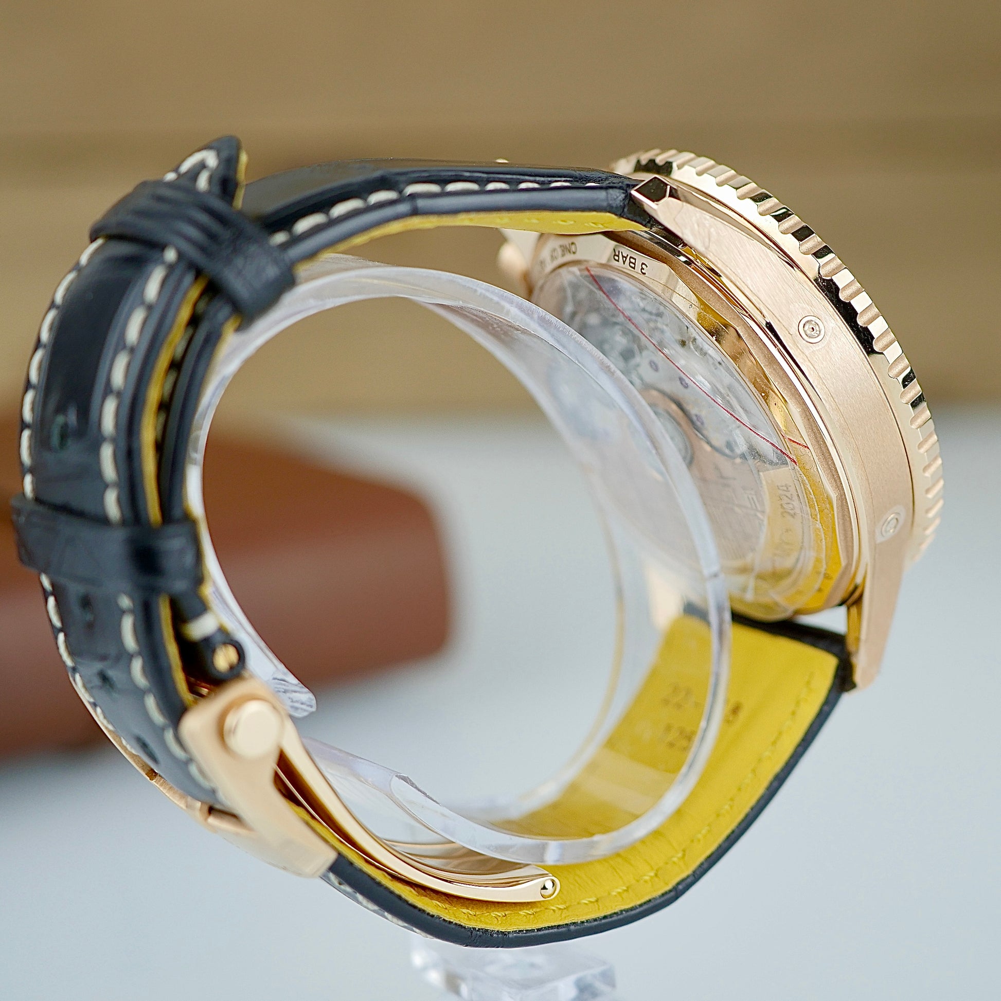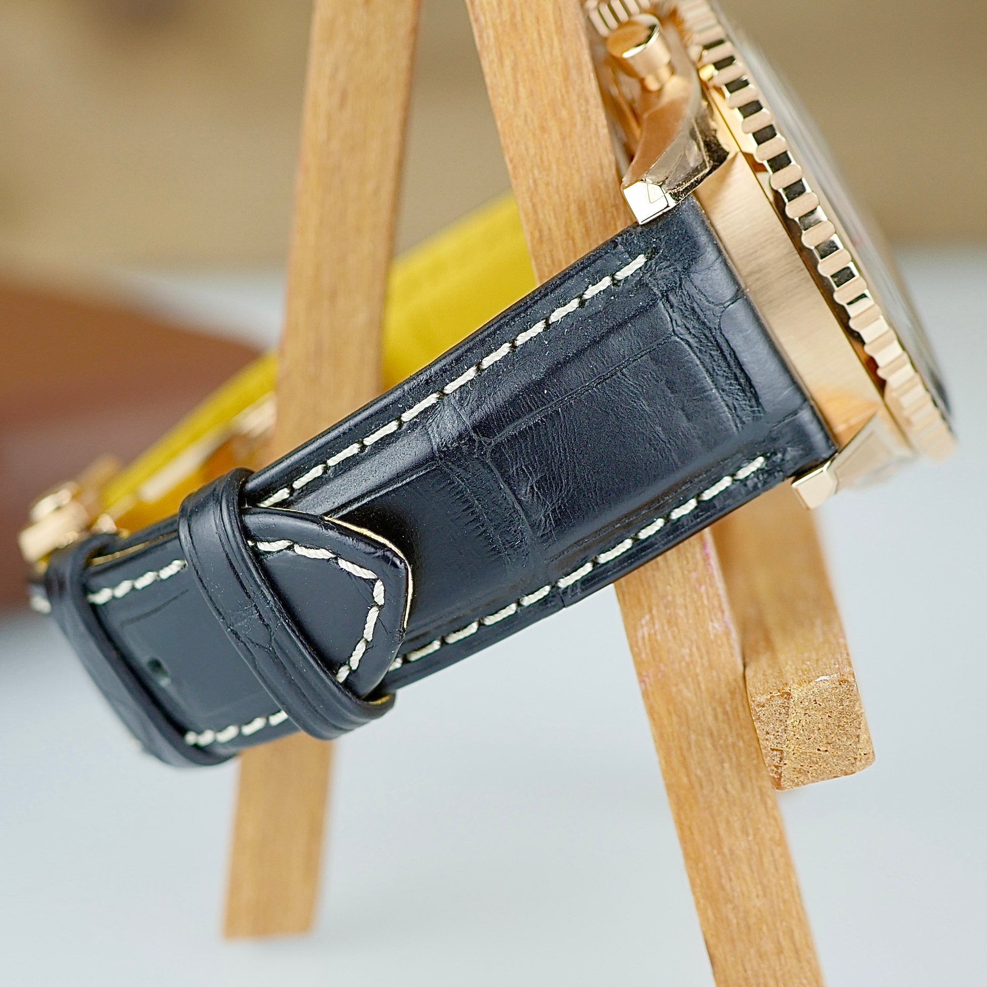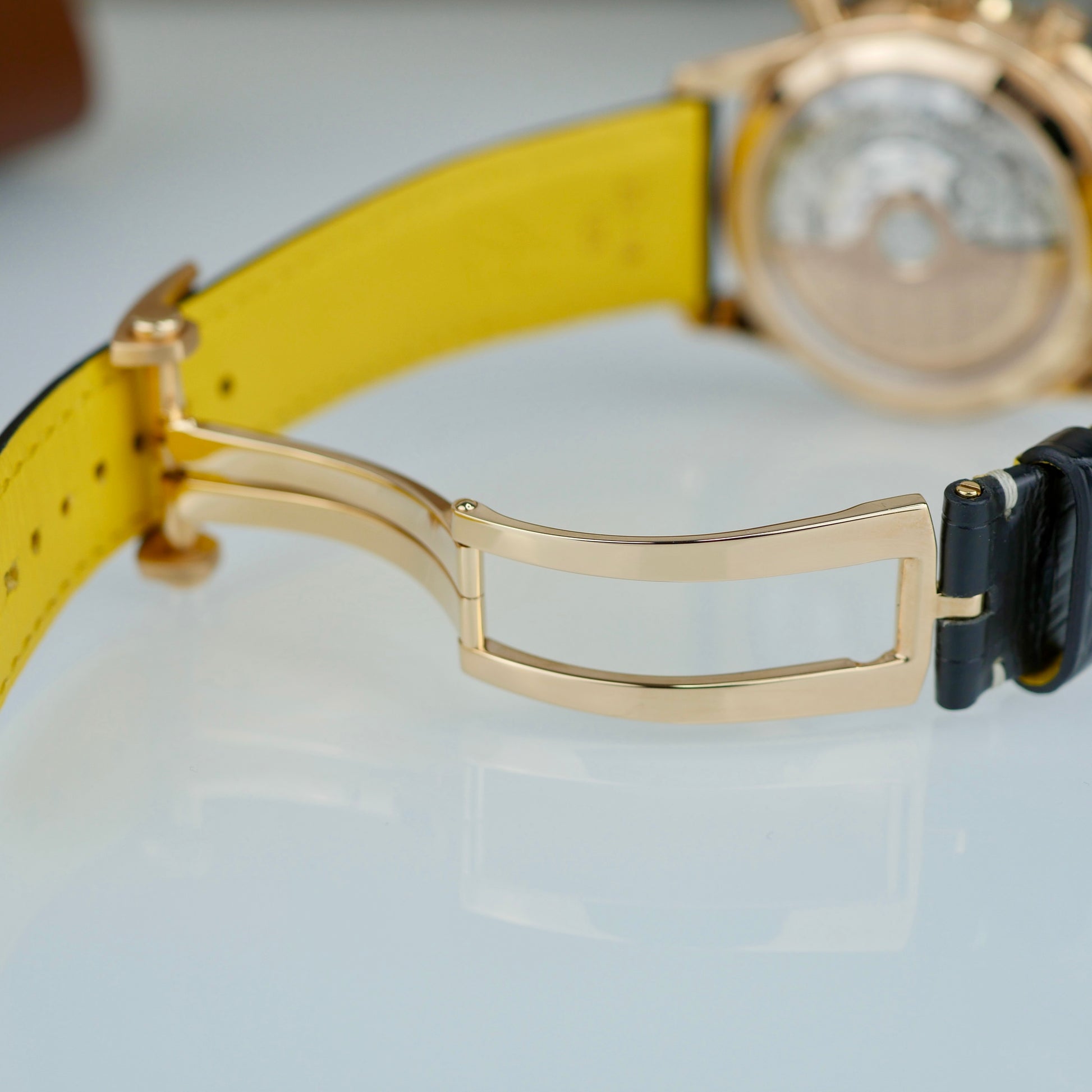 Strap: Black alligator leather with red gold folding clasp