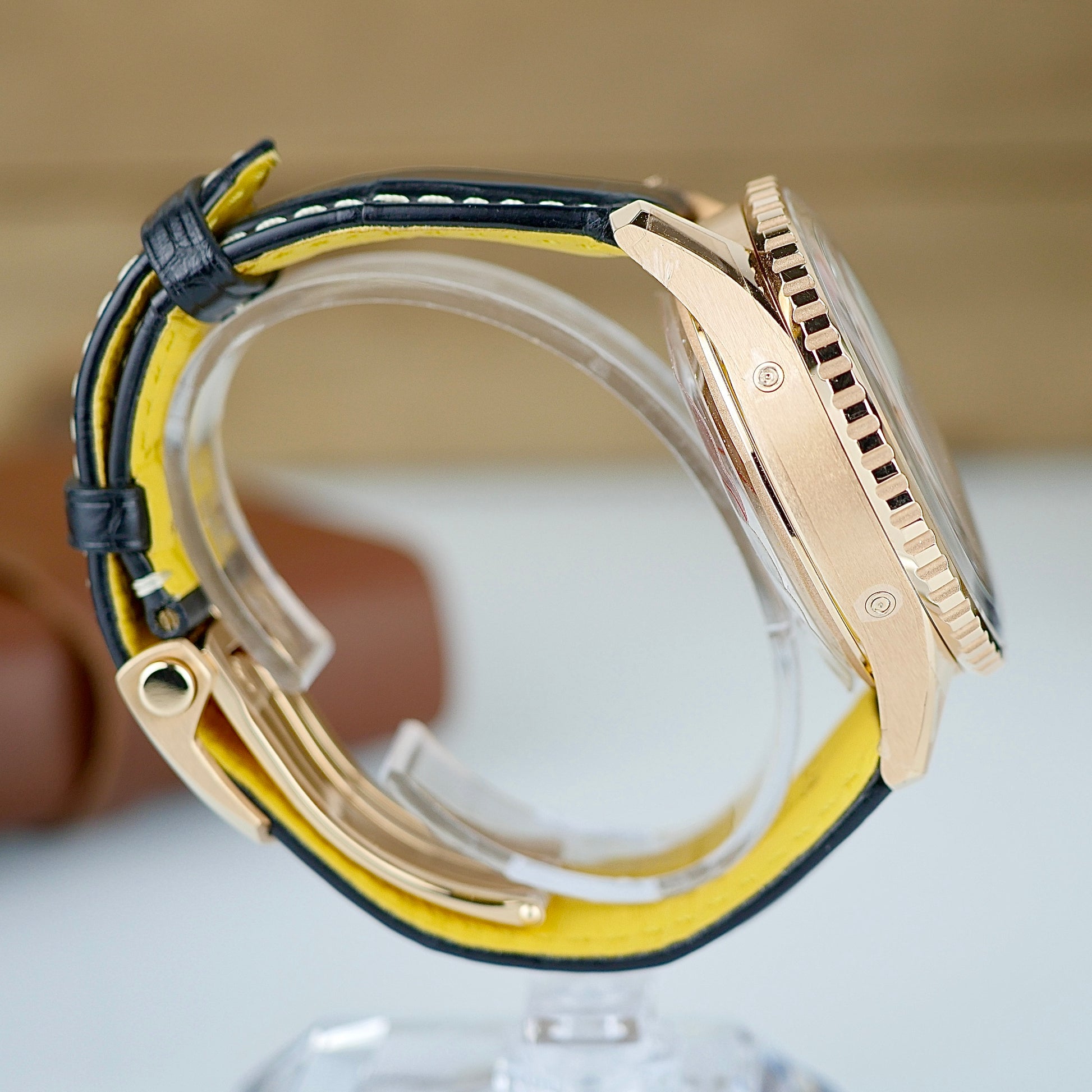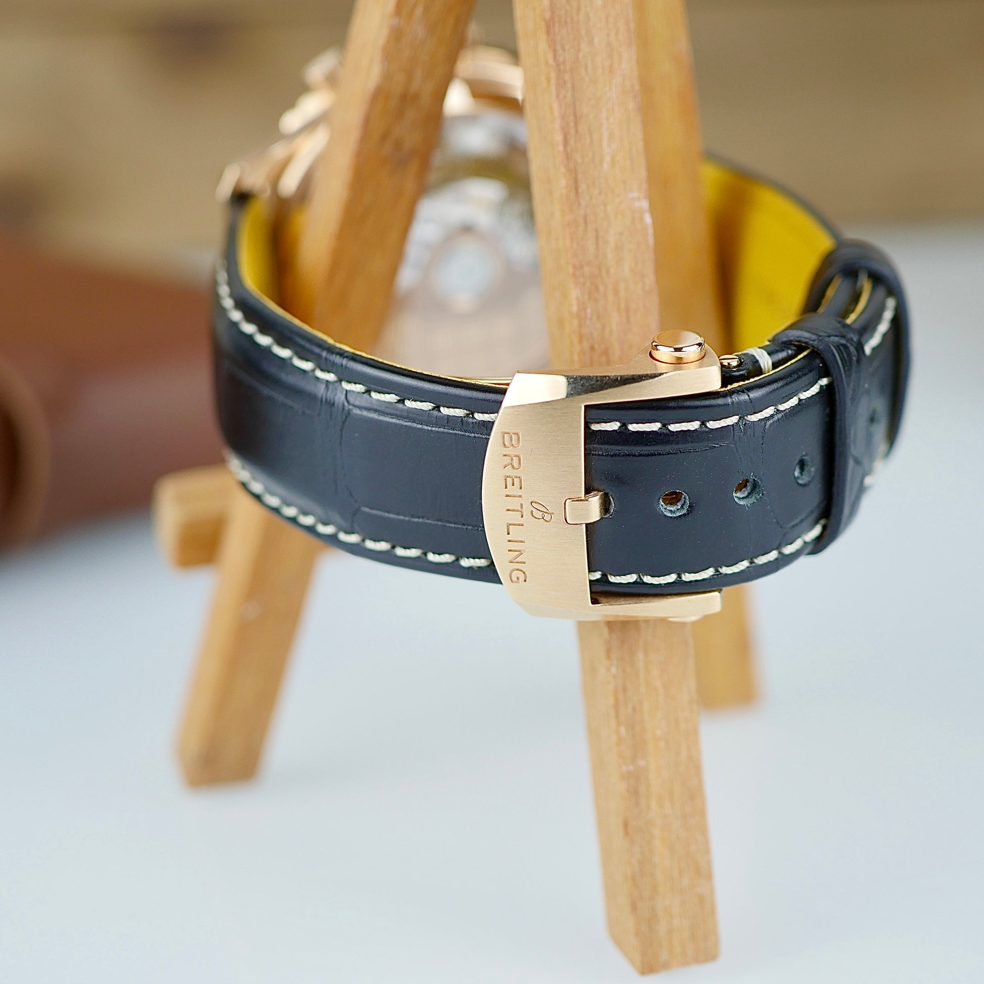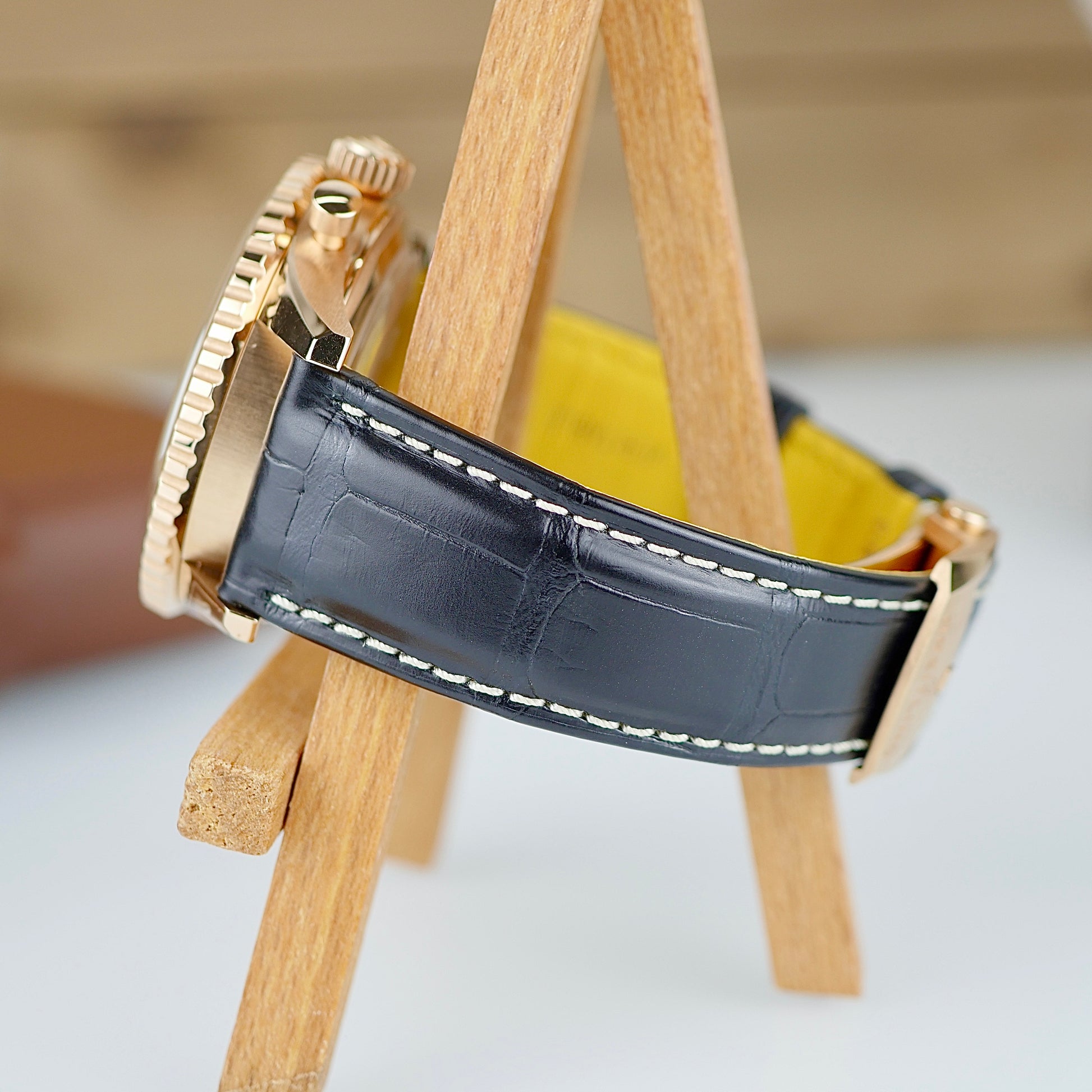 Strap: Black alligator leather with red gold folding clasp