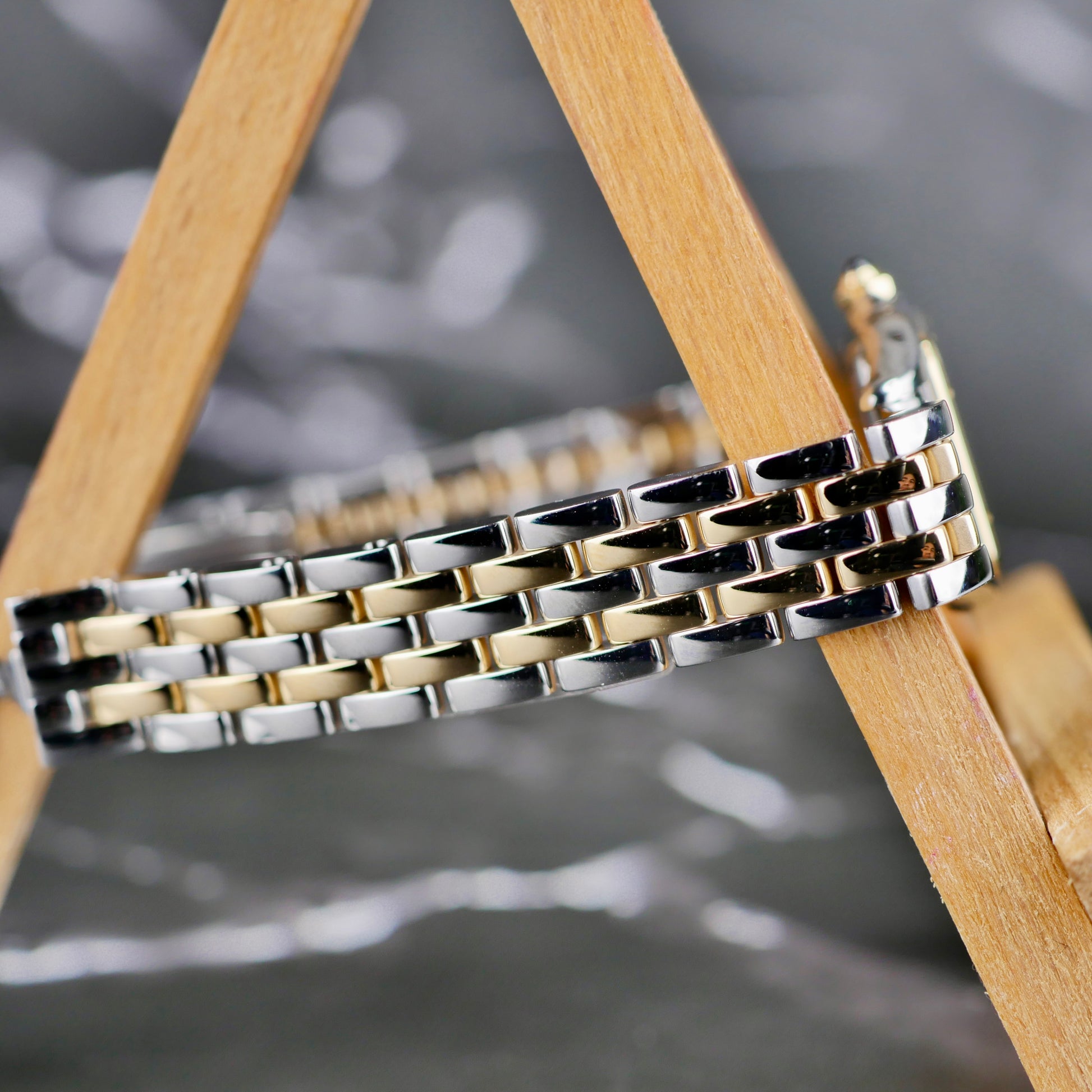 The fluid two-tone Panthère bracelet drapes effortlessly on the wrist, offering exceptional comfort and a distinctly luxurious presence. Paired with Cartier’s classic silver dial featuring Roman numerals and blued steel hands, this watch balances sophistication and everyday wearability with ease.