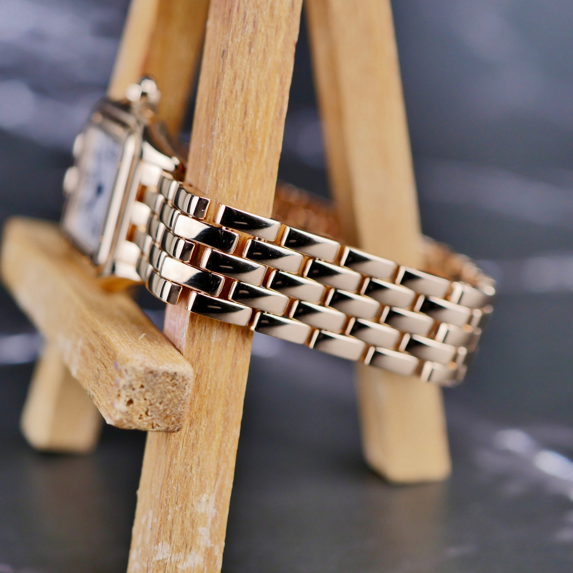 The small-size case offers a graceful, feminine profile, while the integrated rose gold Panthère bracelet drapes effortlessly on the wrist, delivering exceptional comfort and visual warmth. The classic silver dial with Roman numerals and blued steel hands completes the timeless aesthetic that has made the Panthère one of Cartier’s most iconic designs.