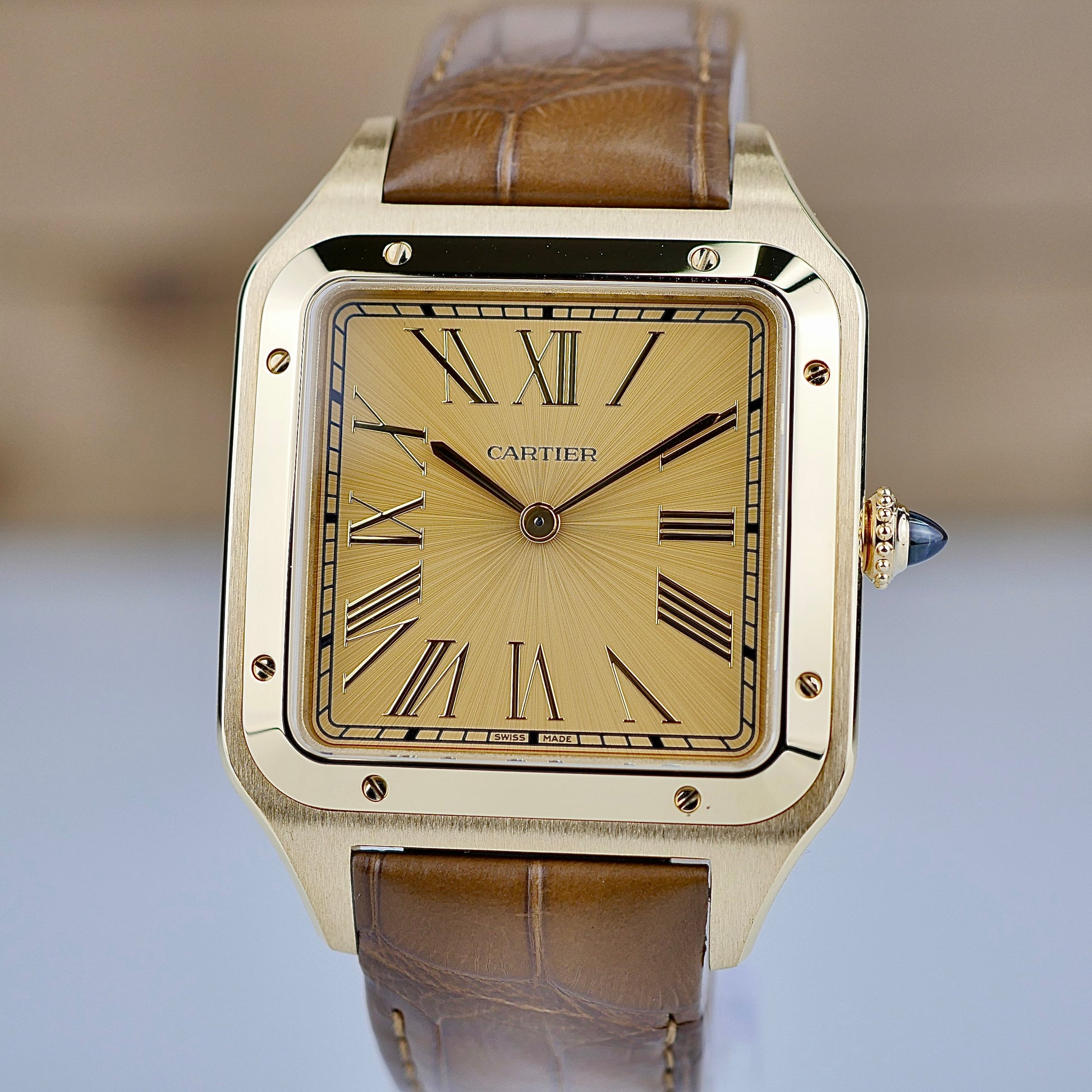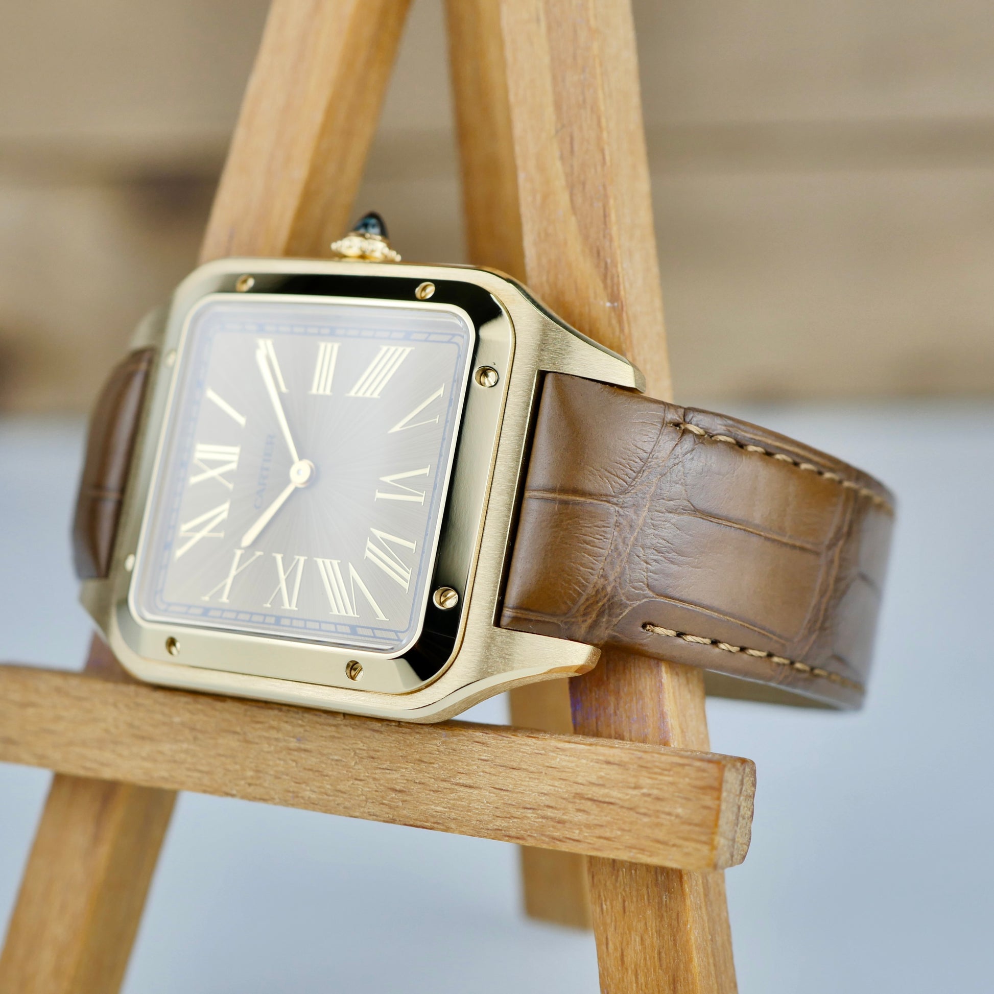 Powered by Cartier’s manual-winding mechanical movement, the Santos-Dumont WGSA0111 offers the tactile joy of traditional watchmaking in an exceptionally wearable, contemporary format. Completing the composition is a hand-stitched brown alligator leather strap with an 18K yellow gold ardillon buckle, delivering both comfort and enduring luxury.