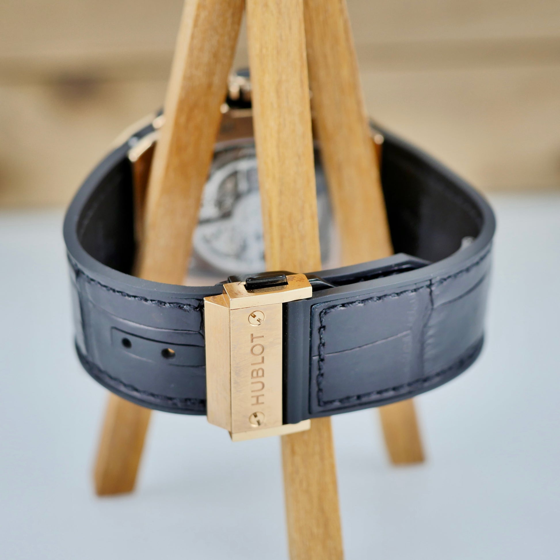 The Hublot Spirit of Big Bang King Gold Ceramic is a bold expression of the brand’s signature Art of Fusion, combining precious metal, advanced materials, and cutting-edge design. Its 45 mm tonneau-shaped case is crafted from 18k King Gold, Hublot’s proprietary warm-toned alloy enriched with platinum, paired with a sleek black ceramic bezel for both contrast and durability.