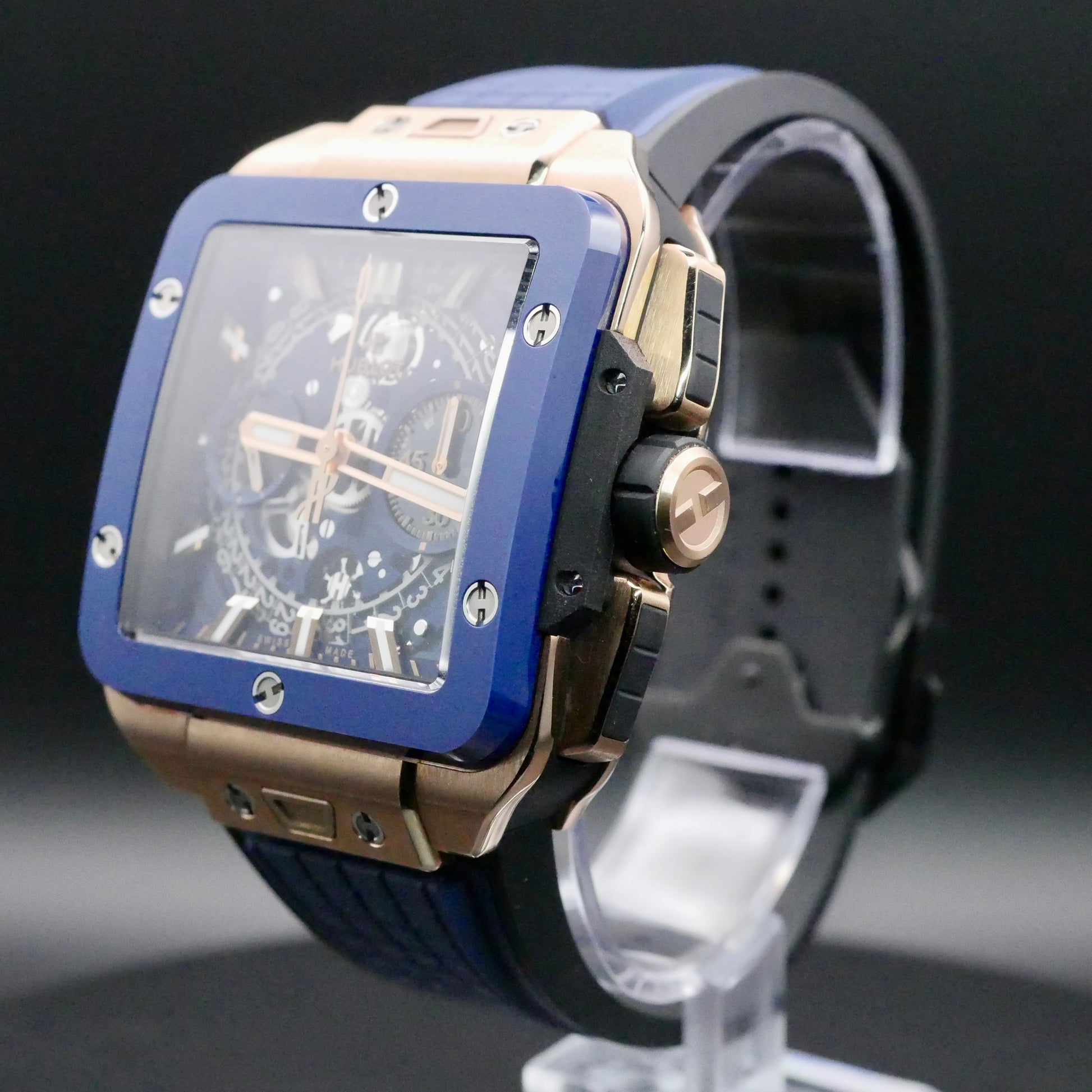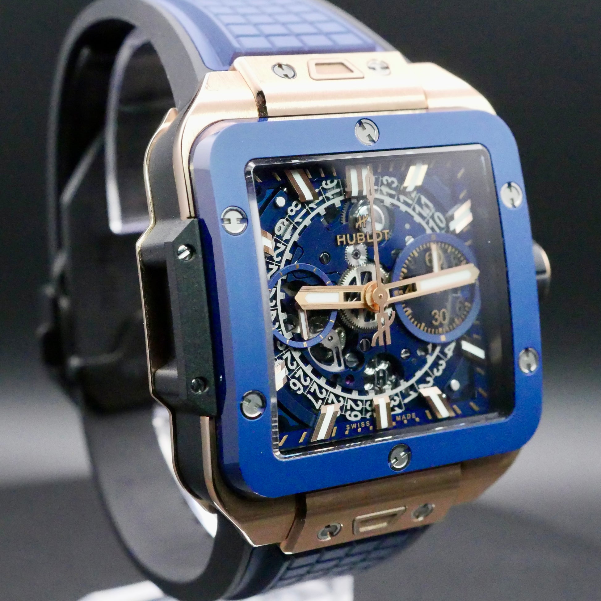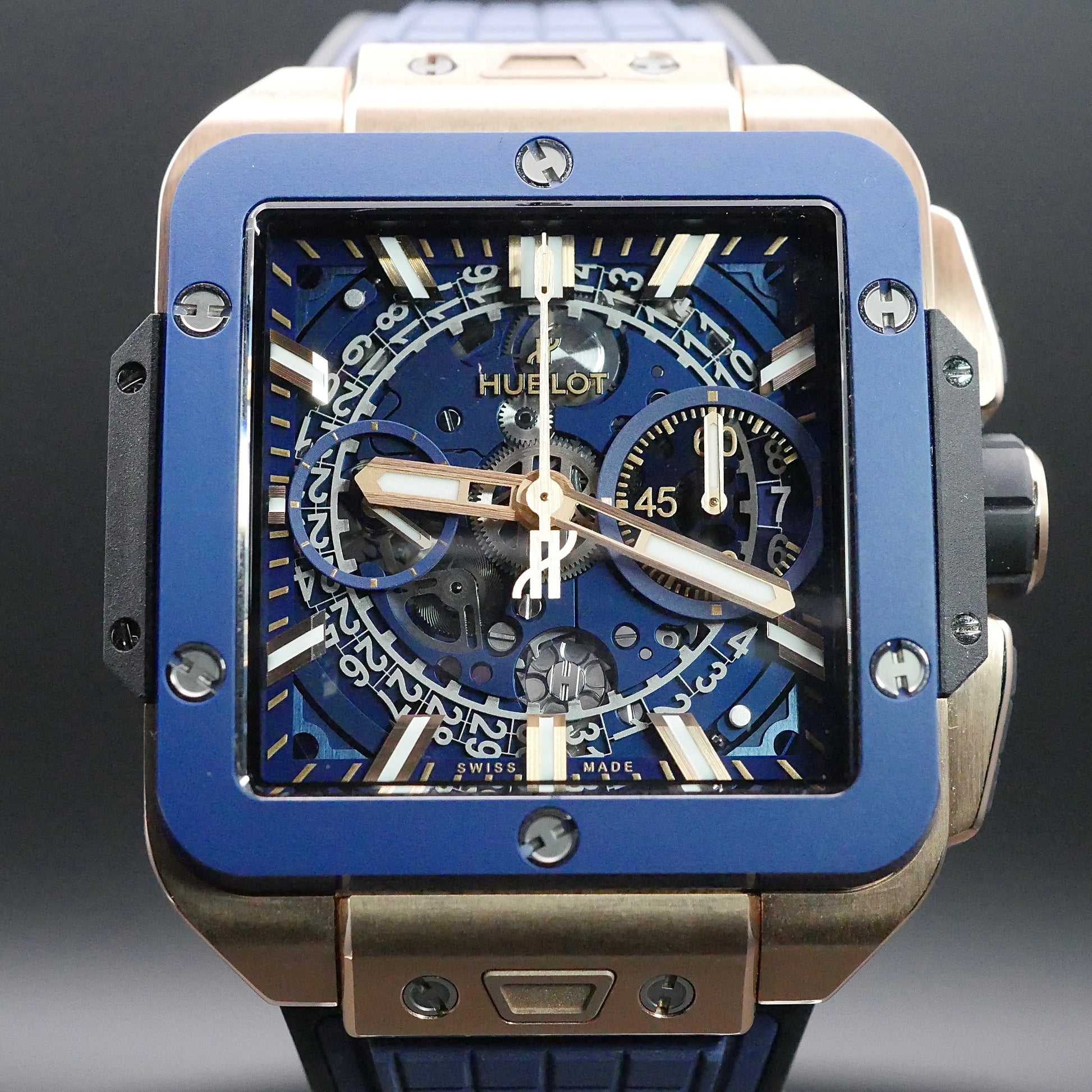 Fitted with a blue structured rubber strap and Hublot’s patented interchangeable system, the Square Bang Unico King Gold Blue balances technical mastery with everyday wearability.