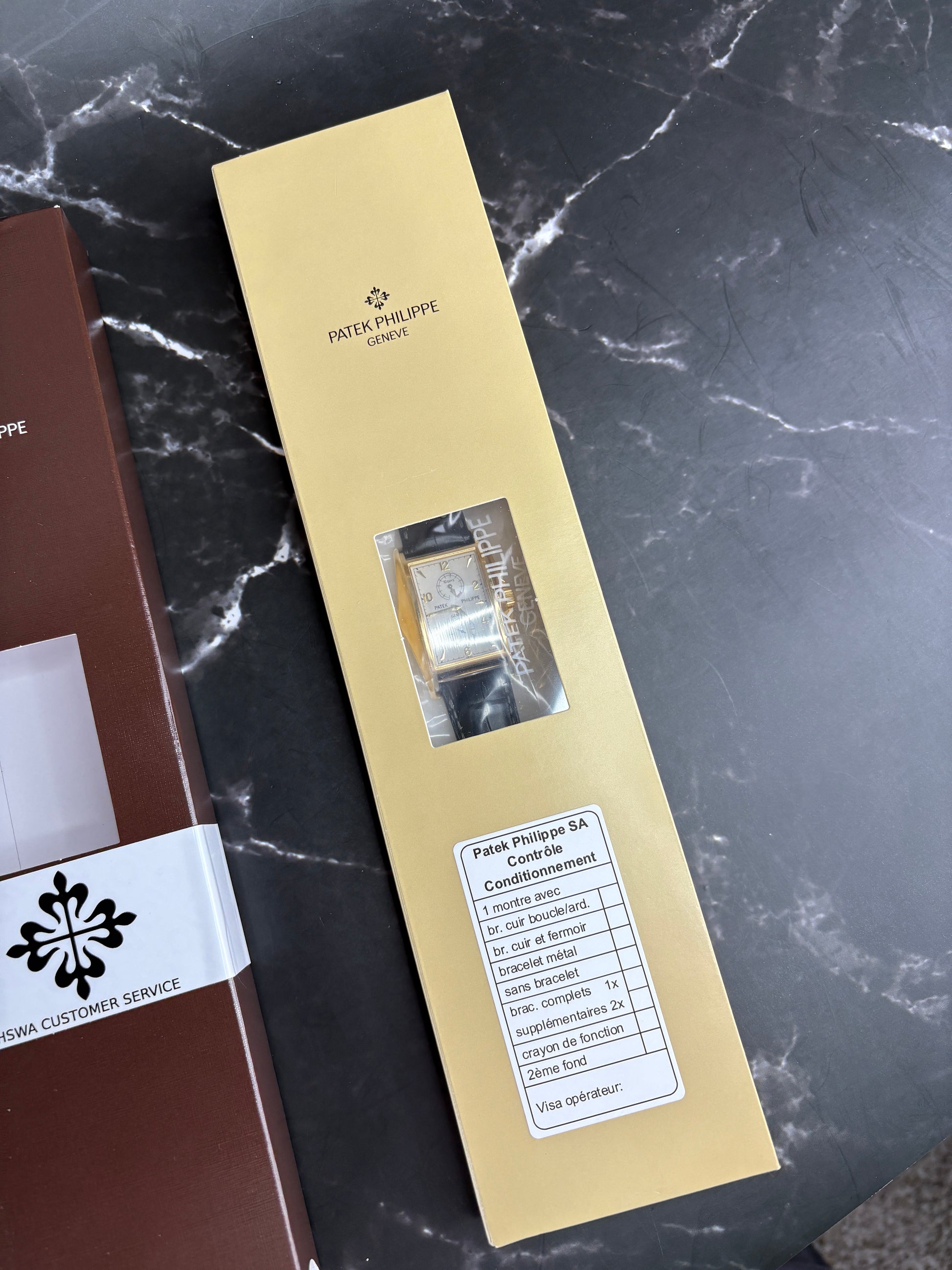 The defining highlight of this example is its condition: the watch has just returned from a full official Patek Philippe service and remains factory sealed, preserving its pristine post-service state. It is fitted with a brand new Patek Philippe strap and is accompanied by complete service documentation, offering exceptional peace of mind and long-term collectability.