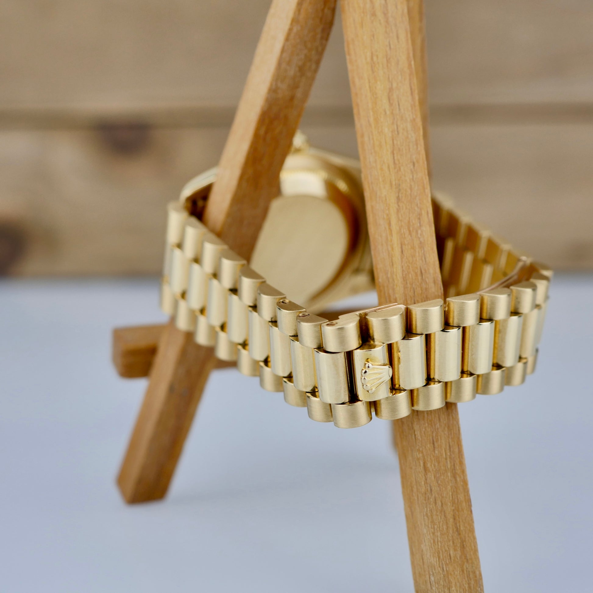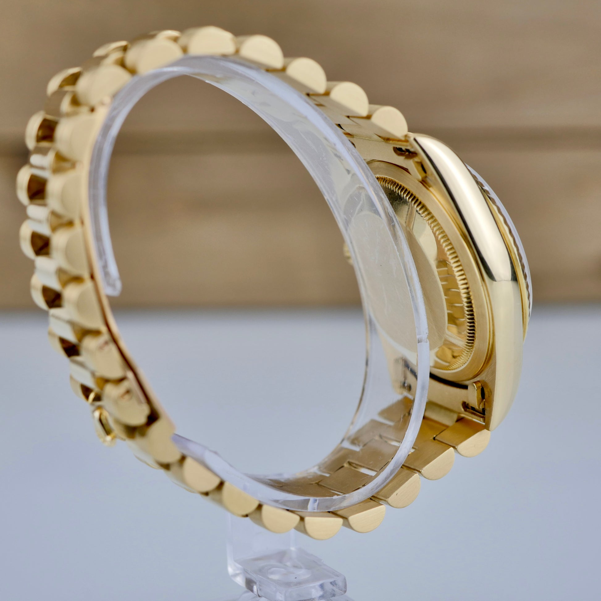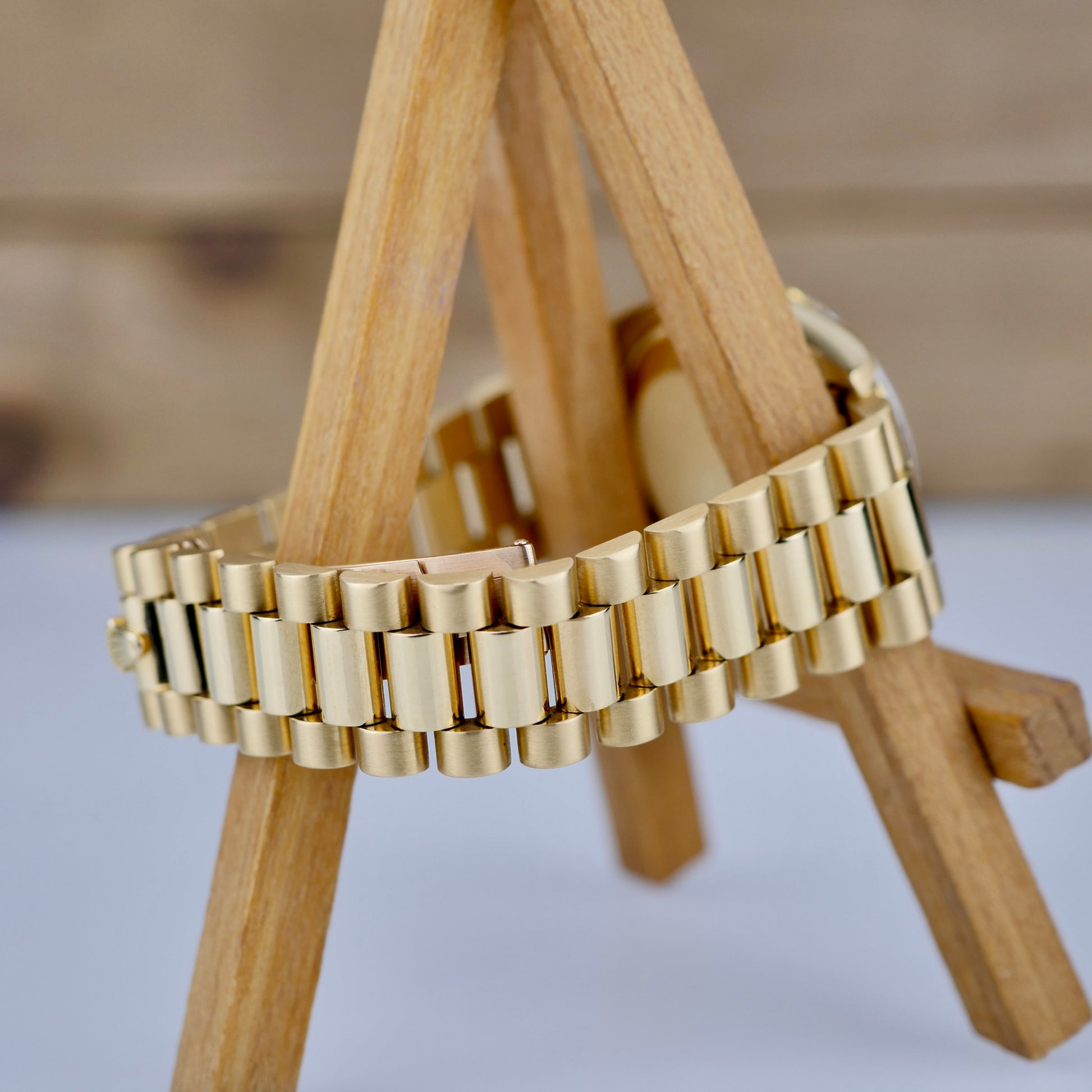 This example is crafted entirely in 18k yellow gold, with a 36 mm Oyster case and the legendary President bracelet, complete with 5-screw removable links and sized to fit a 7.25 inch wrist. Its sapphire crystal with Cyclops lens enhances legibility, while the case retains sharp lugs and clean surfaces — a testament to its well-preserved condition.